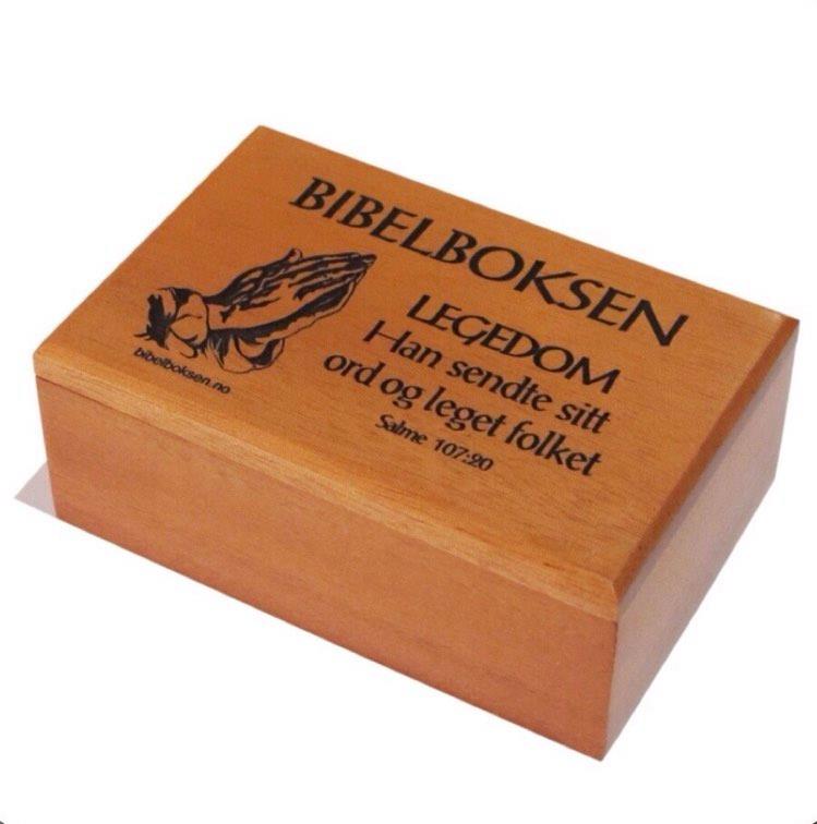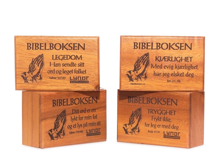 Kjøper du 10 bibelbokser får du de på tilbud til kr 1999,- inkl frakt. Nydelig Mahogniboks som inneholder 100 håndplukkede vers fra Bibelen. Du velger selv hvor mange bokser du ønsker av Trygghetsboksen og Legedomsboksen.