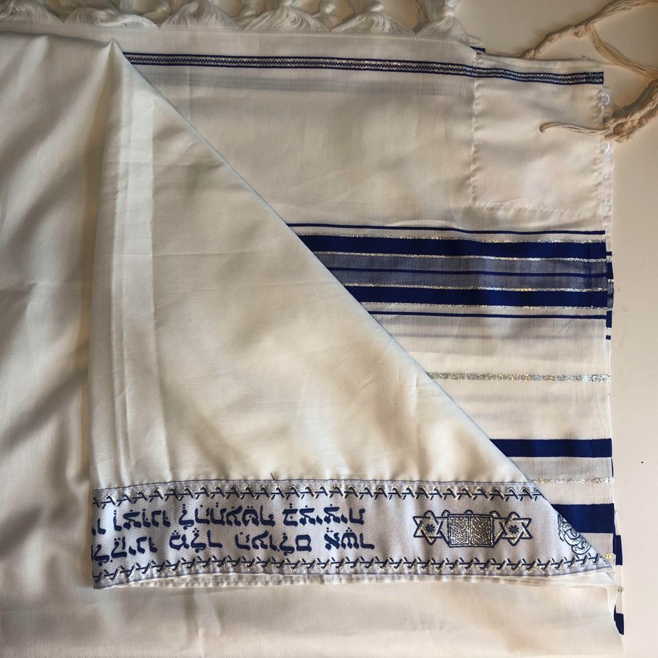 Talit/bønnsjal i hvitt og blått. Godkjent til å brukes i synagogen. Str: 114x173 cm.