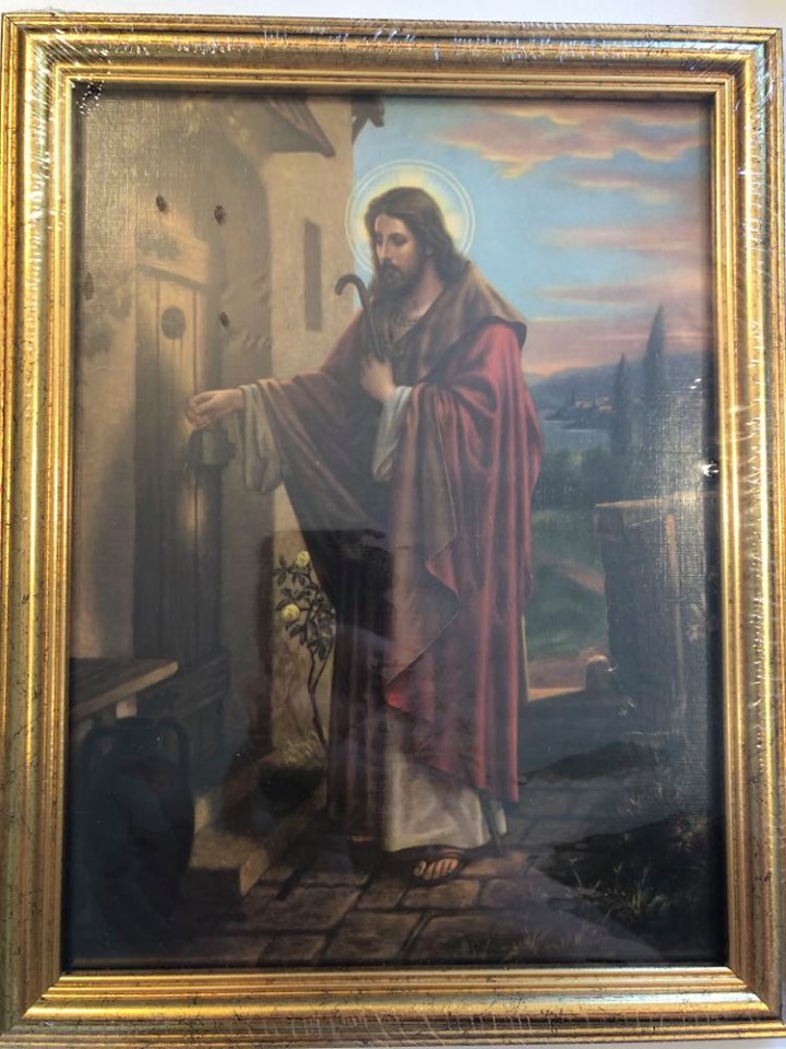 Nydelig bilde av Jesus som banker på døren. Bilde har gullramme.