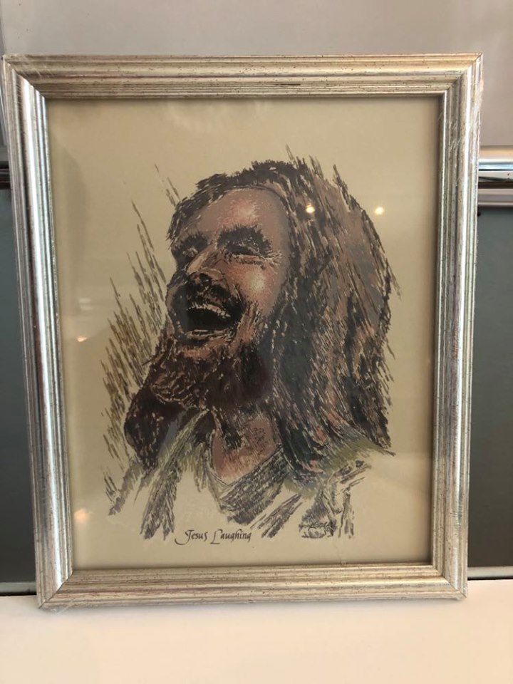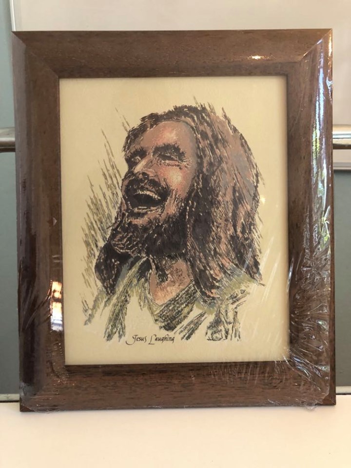 Bilde i svart-hvit av Jesus som løfter opp et barn. Bilde har svart ramme.